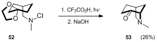 Dalším příkladem tvorby bicyklického aminu Hofmannovou–Löfflerovou–Freytagovou reakcí je Waegellova syntéza derivátu azabicyklo[3.2.1]oktanu 53.[33]