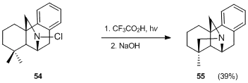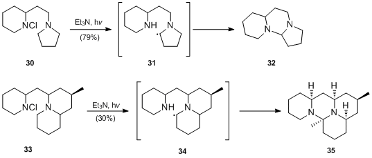 - M. Kimura a Y. Ban zjistili, že sousedící atomy dusíku mohou stabilizovat radikály vytvořené odštěpením vodíkových atomů a umožnit provedení reakce i v mírně zásaditých prostředích.[20][21] Dobrých výsledků lze dosáhnout při ozáření reakční směsi ultrafialovým zářením za přítomnosti triethylaminu, který neutralizuje kyselinu chlorovodíkovou vznikající při cyklizaci. Tato varianta byla použita jako součást syntézy dihydrodeoxyepiallocernuinu 35.[20]