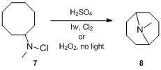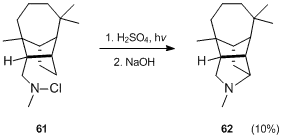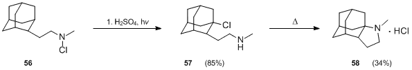 Touto reakcí lze získat také deriváty adamantanu.[35] Reakcí N-chloraminu 56 s kyselinou sírovou za zahřívání reakční směsi se vytváří 2-adamantanon, fotolýzou 56 ve směsi kyseliny sírové a octové při 25 °C po 1 hodinu s využitím nízkotlaké rtuťové lampy vznikal produkt 57 s výtěžností (85 %). Cyklizace 57 byla obtížná, ale s využitím tvrdších podmínek (zahřívání na 290 °C po 10 minut) se ji podařilo provést s 34% výtěžností.