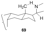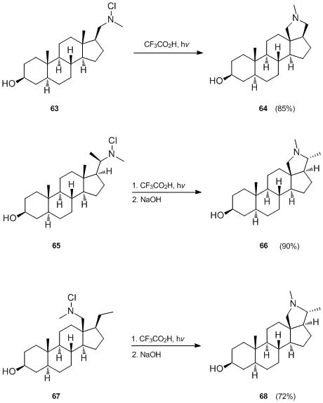 U sloučenin 64 a 66 se se pětičlenné kruhy vytváří atakem neaktivované C-18 methylové skupiny prekurzoru (63 a 65) C-20 vhodně umístěného dusíkatého radikálu. Snadný průběh této reakce zajišťuje stabilita steroidní struktury β-C-18-methylu a to, že vedlejší řetězec β-C-20 obsahující dusíkatý radikál je orientován tak, aby mohlo proběhnout 1,5-odštepení vodíku vytvářející šestičlenný meziprodukt.