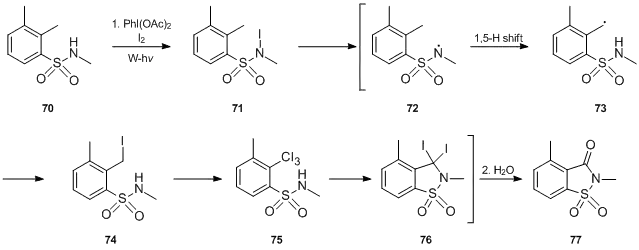 H. Togo et al. zahrnuli Suárezovu variantu do své nové syntetické metody.[42][43] N-alkylsachariny (N-alkyl-1,2-benzisothiazolin-3-on-1,1,-dioxidy) 77 lze snadno připravit se středními až dobrými výtěžky reakcemi N-alkyl(o-methyl)arensulfonamidů 70 s PhI(OAc)2 za přítomnosti jodu a záření z wolframové lampy. V průběhu reakce proběhnou tři cykly 1,5-odštěpení vodíku/jodace o-methylové skupiny; po tomto kroku následuje cyklizace na dijodový meziprodukt 76, jenž je následně hydrolyzován.