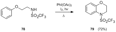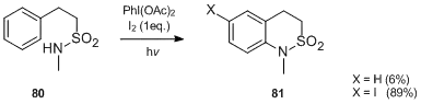 Další přeměny se účastní sulfonamidy primárních amidů s aromatickými kruhy v poloze γ s jodany a jodem za působení záření z wolframové lampy.[44] Produkty jsou 1,2,3,4-tetrahydrochinoliny; tento postup je vhodným pro přípravy šestičlenných cyklických aromatických aminů; sulfonamid 78 prochází vnitromolekulární radikálovou cyklizací za vzniku 79 s dobrým výtěžkem.