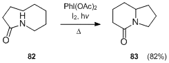 E. Suárez et al. zjistili, že amidylové radikály, vznikající jako meziprodukty při fotolýze středně velkých laktamů 82 za přítomnosti PhI(OAc)2 a jodu, prochází transanulárními odštěpováními vodíku za tvorby vnitromolekulárně funkcionalizovaných sloučenin, jako jsou oxoindolizidiny 83.[46]