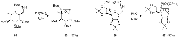 E. Suárez se svými spolupracovníky použil obdobný postup na přípravu chirálních 8-oxa-6-azabicyklo[3.2.1]-oktanů 85 a 7-oxa-2-azabicyklo[2.2.1]heptanu 87;[27] tuto reakci lze považovat za vnitromolekulární N-glykosidaci, jejíž součástí je vniromolekulární 1,5-odštěoení vodíku zprostředkované N-amidovými radikály, po němž probíhá oxidace uhlíkatého radikálu na oxykarbeniový ion, jenž je zachycen ve vnitromolekulární nukleofilní reakci.[27]