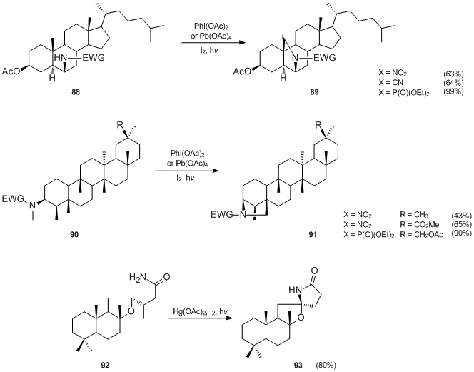 Využitelnost Suárezovy varianty lze ukázat také na přípravách řady steroidů a triterpenů.[25][26][28][29][47] Funkcionalizace iniciované fosforamidáty mívají obecně u N-nitro nebo N-kyanamidů vyšší výtěžnosti.