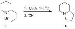 V roce 1878, kdy ještě struktura piperidinu nebyla známa, se August Wilhelm von Hofmann[2] pokusil prokázat přítomnost nenasycené vazby v jeho molekule přidáváním chlorovodíku a bromu (tyto reakce se běžně používají na důkaz přítomnosti alkenů). Během této studie získal několik N-halogenaminů a N-halogenamidů a prozkoumal jejich reakce v kyselých i zásaditých prostředích.[3][4] Popsal také reakci 1-brom-2-propylpiperidinu (3) s horkou kyselinou sírovou, kde po následném přidání zásady vznikl terciární amin,[5][6] který byl později identifikován jako δ-konecein (4).[7]