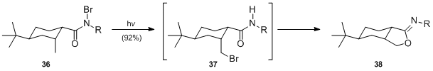 - Fotolýza N-halogenamidů probíhá nejlépe za neutrálního pH. Ozářením N-bromamidu 36 (R=t-Bu) vzniká brommethyl-cyklohexanamid 37, který po přidání zásady vytváří iminolakton 38 s 92% výtěžností.[22]