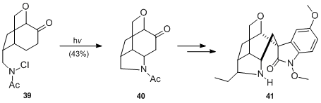 S. W. Baldwin a T. J. Doll provedli jinou obměnu Hofmannovy–Löfflerovy–Freytagovy reakce při výzkumu syntézy alkaloidu gelsemicinu 41. Tvorba pyrrolidinového kruhu sloučeniny 40 byla zajištěna ozářením N-chloramidu 39.[19]