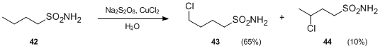 - Další varianta nahrazuje N-halogenaminy sulfonamidy. Za přítomnosti peroxodisíranů a solí kovů mohou sulfonamidy za neutrálních podmínek projít vnitromolekulárními radikálovými funkcionalizacemi vytvářejícími γ- a δ-chloralkenylsulfonamidy. Při reakci za použití Na2S2O8 a CuCl2 byl butylsulfonamie 42 přeměněn na 4-chlorbutylsulfonamid 43 a 3- chlorbutylsulfonamid 44 bez použití kyseliny.[23]