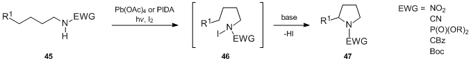 - Nejvýznamnější obměnou Hofmannovy–Löfflerovy–Freytagovy reakce je Suárezova varianta, která zpracovává N-nitroamidy za neutrálních podmínek.[24] Další výzkum této varianty rozšířil spektrum použitelných substrátů na N-kyanamidy, N-fosforamidáty a karbamáty.[25][26][27][28][29] Tyto sloučeniny reagují se sloučeninami hypervalentního jodu za přítomnosti jodu elementárního (I2), přičemž se homolytickou fragmentací jodoamidového meziproduktu vytváří dusíkaté radikály. Tyto N-radikály poté vstupují do vnitromolekulárních 1,5-odštěpování vodíků z neaktivovaných atomů uhlíku, jejímiž produkty jsou pyrrolidiny.