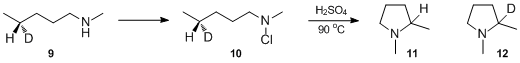 Za účelem zjištění, jestli nahrazení vodíku při cyklizaci N-halogenaminů zachovává či obrací konfiguraci, případně vytváří rovnováhu mezi těmito možnostmi, byl připraven deuterovaný amin 9. Chlorací sloučeniny 9 a následným tepelným rozkladem jejího N-chlorovaného derivátu 10 v kyselině sírové při 90 °C vznikal opticky neaktivní 1,2-dimethylpyrrolidin. Tento výsledek byl silným důkazem průběhu přes meziprodukt obsahující sp2-hybridizovaný δ-uhlík.