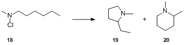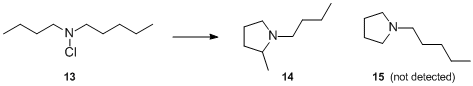 Zkoumáním radikálového rozkladu N-chlorbutylamylaminu 13 byly určeny relativní rychlosti přenosů u primárních a sekundárních vodíků. Za podmínek reakce se vytvářel pouze 1-n-butyl-2-methylpyrrolidin 14, 1-n-amylpyrrolidin 15 pozorován nebyl; tímto se potvrdilo, že radikál přednostně reaguje se sekundárním vodíkem.