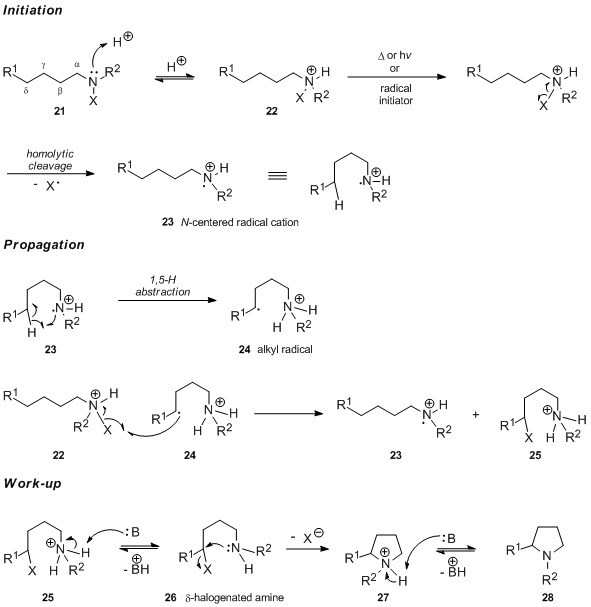 - Výchozími látkami mohou být N-chlorované, N-bromované, nebo N-jodované aminy. Při tepelné iniciaci dávají N-chloraminy lepší výtěžky než N-bromaminy, protože jsou tepelně stabilnější.[18] U fotoiniciovaných reakcí se naopak vyšších výtěžků dosahuje při použití N-bromaminů.[11]