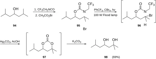 V roce 2008 byl popsán nový způsob přípravy 1,3-diolů pomocí varianty Hofmannovy–Löfflerovy–Freytagovy reakce.[48]