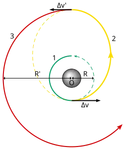 Celková změna rychlosti , která je třeba pro manévr se dá rozdělit na dva členy: vstoupení na Hohmannovu elipsu () a pak na cílovou kruhovou dráhu (). Změny rychlostí se dají vyjádřit pomocí rozdílu rychlostí na jednotlivých úsecích dráhy.