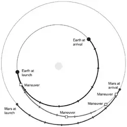Na obrázku vpravo je vykreslena dráha sondy Mars Reconnaissance Orbiter, která využila jinou dráhu, než energeticky optimální Hohmannovu elipsu, ale její cesta k Marsu trvala pouze 7 měsíců.