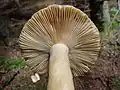 Křehké, bledé lupeny jsou u třeně připojené, na klobouku středně hustě uspořádané, postupně však řídnou. Bývají propojené žilkami, někdy i větvené. Výtrusný prach je bledě krémový.[1][2][3]