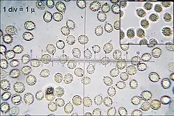 Výtrusy 5–7µm kulovité až elipsovité, někdy tvoří neúplnou síťku. Výtrusový prach je bílý.[1]