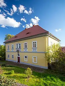 Vznik farní školy na čp. 63 (vedle farní budovy) není znám, ale roku 1674 je zmiňován školní správce (Schulmeister) Mathes Teufel. Listina z 12. června 1700, uložená v cibuli kostelní věže, hovoří o výměně farních a školních pozemků nedaleko kostela za pozemky tehdy ještě panského hostince čp. 61. Je tedy pravděpodobné, že k výstavbě školní budovy, která v červnu 1809 vyhořela, došlo už někdy v 17. století.[21] Požár v roce 1809 tehdy poškodil i kostel s farou (čp. 62) a jednotřídní škola (čp. 63) musela být nově vystavěna. V pol. 19. století navštěvovalo obecnou školu 144 žáků a na škole vyučoval Anton Herrmann (* 1806).[26]