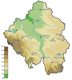 Severozápadní část území se rozprostírá na Slezské nížině, která náleží do subprovincie Středopolské nížiny. Pahorkatiny se vyskytují především na východě, jsou začleněny do oblastí Slezská vysočina a Woźnicko-wieluńská vysočina. Nejvyšším bodem ve slezských pahorkatinách je Hora svaté Anny (408 m n. m.). Jižně od nich se táhne pás Severních Vněkarpatských sníženin (Osvětimská a Ostravská pánev) a Západobeskydské podhůří. Opavská pahorkatina je řazena k Slezské nížině a Zlatohorská vrchovina k Jesenické oblasti.