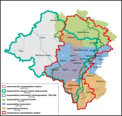 Mapa Horního Slezska (chápaného jako bývalý vládní obvod Opolí + Rakouské Slezsko) | |