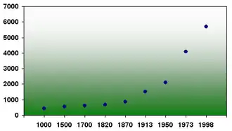 Tempo růstu GDP per capita od 1000. – 1998. Zatímco v období do roku 1800 je průměrný meziroční růst menší než 0,1 %, tak ve 20. století přesahuje 1 %