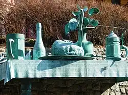 Na tradici sklářského průmyslu odkazuje skleněná váza a chloubu liberecké botanické zahrady – unikátní sbírku masožravých rostlin – zastupuje mucholapka podivná,[14] která je do vázy zasazena. Kousek od ní je krabička od cigaret a historický německý pivní džbán kriegel s uchem a cínovým víčkem.[pozn. 1]