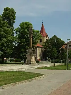 Před zámkem stojí 9 metrů vysoký pískovcový mariánský sloup z roku 1734. Čtyřhranný sloup s mariánským reliéfem obklopují sochy sv. Vavřince, sv. Kateřiny, sv. Floriána a sv. Víta.