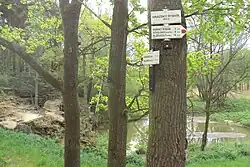 Přes hráz rybníka vede červeně značená turistická cesta od Holan směrem na Stvolínky a Blíževedly.