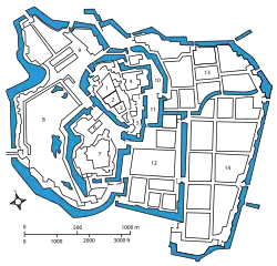 1) Óoku 2) Naka-Oku 3) Omote 4) Ninomaru-Goten 5) Ninomaru 6) Momidži-jama 7) Nišinomaru 8) Fukiage 9) Kitanomaru 10) ? 11) Sannomaru 12) Nišinomaru-šita 13) Óte-mae 14) Daimjó-Kódži