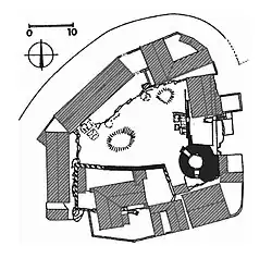 Hradní jádro mělo trojúhelný tvar. Z nejstarší stavební fáze v něm pochází jen spodní část bergfritu a přilehlá část hradby, které jsou vyzděné z menších kamenů. Malé nádvoří obklopovala tři palácová křídla. Severní zmizelo prakticky beze stopy, protože skála pod ním byla z velké části odtěžena. Z čelního paláce na východní straně stojí část nádvorní stěny s obloukem vstupu do suterénu. Drobný fragment ostění portálu v téže zdi dokládá výškovou úroveň původního vstupu. Ze třetího paláce se dochovala nádvorní a části bočních stěn.[7]