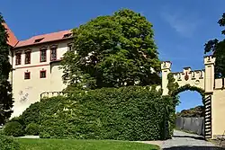 Ochoz zaklenutý křížovou klenbou okolo prvního patra nádvoří byl postaven okolo roku 1670. Ze stejné doby pochází malované stropy v prvním patře severního křídla. Při romantizující přestavbě v devatenáctém století byla zvýšena vstupní věž do předhradí a po pravé straně za ní vznikla budova pivovaru. Vlevo od věže byla zřízena nová novogotická brána.[10]