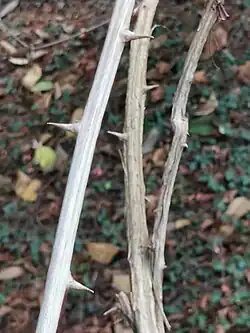 Liána mívá lodyhu dlouhou až 10 m, juvenilní jsou zelené, měkké a ovíjivé, kdežto staré dřevnatí. V mládí jsou porostlé téměř protilehlými jednoduchými listy s řapíky až 5 cm dlouhými. Na starších lodyhách listy postupně opadávají a s nimi i části řapíků, zůstanou však jejich bazální části přirostlé k lodyze. Tyto zbytky posléze ztvrdnou a vytvoří asi 1 cm dlouhé ostny, jež pomáhají pnoucí lodyze přidržovat se ovíjené podpěry.