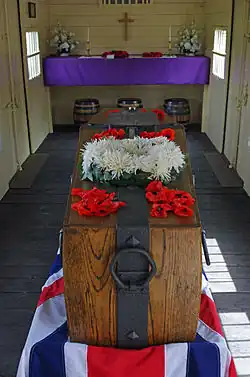 Následujícího rána vstoupili do hradní knihovny dva pohřební zřízenci a uložili rakev do sarkofágu z dubových trámů ze stromů od paláce Hampton Court.[1] Sarkofág byl opásán železem a byl na něj připevněn křižácký meč, osobně vybraný z královské sbírky Jiřím V., přes nějž byl přibit železný štít s nápisem „Britský válečník, který ve Velké válce v letech 1914–1918 padl za krále a za vlast“.