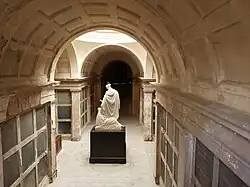 V bočních lodích se nachází celkem osm lavic. V hrobce je 144 pohřebních komor.[15] Nebožtíci jsou pochováni v rakvích za velkými deskami z černého mramoru se jménem zesnulého, případně s krátkými úryvky Starého a Nového zákona.