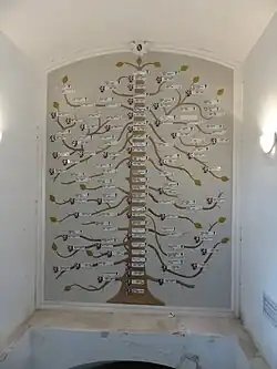 Následující schéma znázorňuje příbuzenské vztahy. Červeně orámovaní byli pohřbeni v hrobce, arabské číslice odpovídají pořadí úmrtí podle předchozí tabulky. Římské číslice představují pořadí manžela nebo manželky, pokud někdo uzavřel sňatek více než jednou. Vzhledem k účelu schématu se nejedná o kompletní rodokmen Thun-Hohensteinů.[13][6]