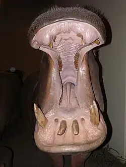 Dobře vyvinuté jsou zuby. Řezáky ve spodní čelisti jsou kolíkovité a míří šikmo dopředu, špičáky jsou přeměněny v kly, zejména u samců dosahují úctyhodných rozměrů. Z dásní vyčnívají asi 35 cm a celkově mohou měřit až 70 cm. Slouží především k varování a jako zbraň ve vzájemných soubojích. Špičáky i řezáky v horní čelisti jsou mnohem menší a mají kolíkovitý tvar. Zatímco špičáky a řezáky hrochům rostou po celý život, stoličky se postupně vyměňují, obdobně jako u slonů. Trávu a jiné rostliny trhá hroch mohutnými tuhými kožovitými pysky, stoličkami ji rozmělňuje. Zuby používá i k dobývání kořenů vodních rostlin. (Síla stisku čelistí činí okolo 8100 newtonů.[5])