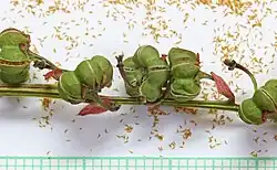 Plod je zelená, převislá, kulovitá, pukavá, suchá tobolka o průměru 5 mm. Otvírá se odzdola pěti chlopněmi a obsahuje mnoho vejčitých, velmi drobných semen.[1][2][4][6]