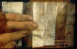Zvláštním způsobem složený kus papíru nacházející se ve figurantově ruce je notový zápis s notami a písmeny. Vzhledem ke špatnému stavu spodní části obrazu jsou noty a písmena z velké části nečitelné.[6][6][11] To nebránilo některým badatelům v tom, aby vyslovili hypotézy, co písmena znamenají, a často se na základě jejich výkladu snažili podpořit právě tu svou teorii o hudebníkově identitě.[18] Částečně vymazaná písmena lze rozeznat jako „Cant“ a „An“[19] a obvykle se čtou jako „Cantum Angelicum“, latinsky „andělská píseň“, i když historik umění Martin Kemp poznamenává, že by mohlo jít o „Cantore Angelico“, italsky „andělský zpěvák“.[6] Poznámky nenabídly příliš mnoho vysvětlení k obrazu,[4] kromě toho, že silně naznačují, že námětem je hudebník.[20] Jsou v mensurální notaci, a proto pravděpodobně zachycují polyfonní hudbu. Leonardovy dochované kresby rébusů s notovým zápisem nacházejících se v tiskárně hradu Windsor se hudbě vyobrazené v Hudebníkovi nepodobají. To naznačuje, že tato hudební skladba není Leonardovým dílem, takže skladatel a význam hudby zůstávají neznámé.[4]
