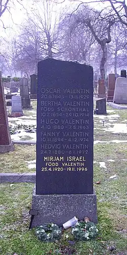 Valentin zemřel v Uppsale v roce 1963 ve věku 74 let. Je pohřben na židovském hřbitově v Solně.[1] Jeho dcera Mirjam (1920-1996) se stala psycholožkou a odbornicí na výchovu dětí. V roce 1946 se svým manželem Joachimem Israelem napsala knihu „Det finns inga elaka barn“ (Neexistují žádné zlé děti).[10]