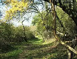 ![]() Úvoz na okraji lesa mezi plošinou Amerika u Dřevčic a rozcestím před Martinskými stěnami v Roverských skalách. Vlevo základy menší stavby, zatesané do skály. | |