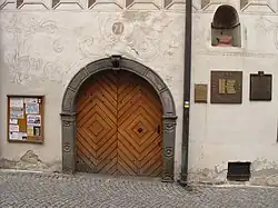 - 398. Prachatice, Husova ulice, dům čp. 71 (Husův dům), hlavni vstup, sgrafito, kolem 1560.