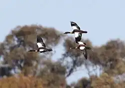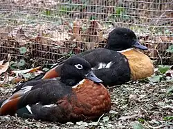 - ↑ a b c GRIFFIN, P. Chestnut-breasted shelduck [online]. New Zealand Birds Online, 2013, rev. 2022 [cit. 2023-09-05]. Dostupné online. (anglicky)