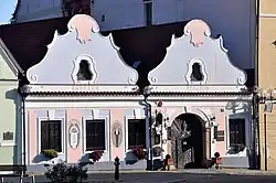 Jedná se o přízemní dům. Jeho průčelí je rozdělené na dvě části (má dva štíty). Nápadné jsou především prolamované voluty Je jednopodlažní. V pravé části je vjezd do dvora. Dům v současné době slouží jako kavárna a ubytovací zařízení.