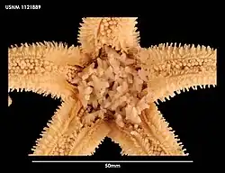 | Valvatida Perrier, 1884 | Některé druhy mají paxilly a klepítkaté pedicelárie. Široce rozšířený řád.[17][18] Mají dobře vyvinut zažívací systém, který je pevně uchycen do tělní stěny.[14] Tento řád má největší batymetrický rozsah výskytu (0–6720 m).[20] | hvězdice síťovaná |