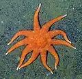 | Velatida Perrier, 1884 | Většinou mají 5–15 ramen a silné tělo s mohutným diskem. Tělo pokrývá velké množství papulí. Žijí v chladných hlubokých mořích.[17][18] | Solaster paxillatus |