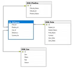Ve schématu databáze níže je znázorněn model pro záznam dat ze sklizní pro zemědělský podnik. V tabulce FA_Sklizeno se uchovávají záznamy o sklizních. Konkrétně záznamy o počtu sklizených tun a výměře sekání. Dále jsou zde hodnoty cizích klíčů pro dimenze DIM_Cas, DIM_Pole, DIM_Plodina. Ve všech dimenzích je na první pohled vidět, že budou obsahovat denormalizovaná data, konkrétně například dimenze DIM_Pole obsahuje názvy katastrů v textové podobě.