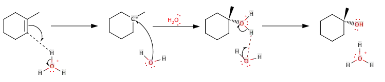 Při hydrataci alkenů se na jeden uhlík tvořící dvojnou vazbu naváže hydroxylová skupina (OH), zatímco na druhý se naváže proton (H+); tato reakce je značně exotermní. Nejprve alken zreaguje s protonem podle Markovnikovova pravidla, následně se molekula vody naváže na více substituovaný uhlík. Atom kyslíku se tím stane trojvazným a kladně nabitým. Další molekula vody odštěpí proton a přemění se na hydroniový kation (H3O+). Při reakci vzniká řada vedlejších produktů (například při výrobě ethanolu se také tvoří diethylether).