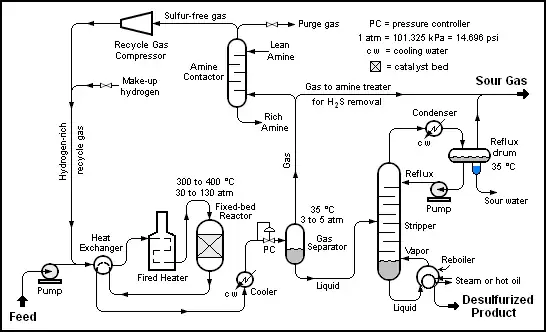 Na následujícím obrázku je zjednodušeně zobrazeno vybavení používané v hydrodesulfurizačních jednotkách.