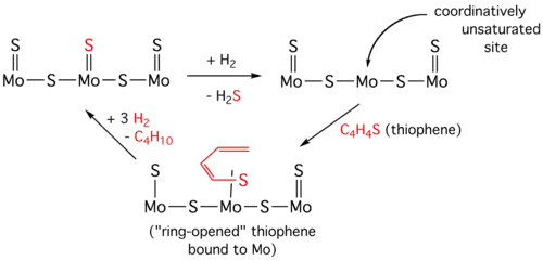 Hlavními katalyzátory HDS jsou směsi sulfidu molybdeničitého (MoS2) s malými množstvími jiných kovů a jejich sloučenin.[12] Vlastnosti katalytických míst jsou stále předmětem výzkumu, ale předpokládá se, že základní roviny struktury MoS2 na katalýzu nemají vliv a účastní se jí vrcholy nebo hrany krystalových mřížek.[13] Na okrajích krystalů může molybdenové centrum stabilizovat koordinačně nenasycená místa. Substráty, jako jsou thiofeny, se navazují na tato místa a procházejí posloupnostmi reakcí, které mají za následek štěpení vazeb C-S a hydrogenace vazeb C=C. Vodík tak zajišťuje odštěpování sulfidových iontů, hydrogenace a hydrogenolýzy. Na následujícím obrázku se nachází zjednodušený diagram tohoto procesu:
